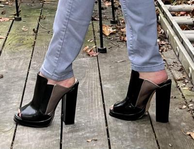 Several months ago, I bought these rather clunky shoes for a mere 18 USD. The price point was the motivator, but the real reason I bought them is because they are steep. They are very nearly the equivalent of 12 cm on size 38. I am not sure just exactly how ugly they are, but they are serving the purpose. After walking a mile in these babies, I can really feel it! In real life, they are not the greatest. I have to wear bandaids with these shoes, or they eat holes in the tops of my feet. The liner is deteriorating, so when I take them off, my feet come out all blackened. I need to get them reheeled, but I'm reluctant to spend money on them. I guess I need to look at them as a tool, rather than something I actually find attractive. The silver part is actually kind of cool, but that's about it. Sundays are often my best training days, because I can often spend the entire day in heels. I did not wear these the entire day, by the way, only for a one mile walk. The rest of the day I spent in 10 cm.