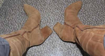 2. I wear my heels 12 hours on most days and sometimes 16 hours. Only time I'm in flats is when I'm barefooted or working in my garden or kayaking. Today its my Nine West Samreno suede block heeled knee highs, 10 cm
