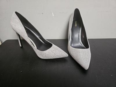 I got these the other day in a thrift store for less than $20. The brand is Aldo. And the heel is 4.5". The colour is a fine, almost tweed like grey. It reminds me of the snow that you use to get on your TV. They are very roomy and comfortable, but not loose.