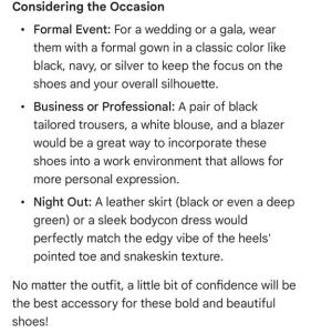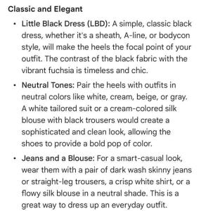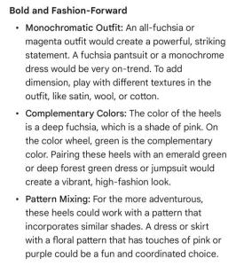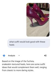 There are many version of Artificial Intelligence begining to appear on cell phones. They can basically do just about anything for you now. For those with an Andriod phone, Gemini is the new thing. There is even commercials for it now. In the latest commercial, a girl snaps a photo of her outfit. Then she asks gemini, "what makeup look would go good with this outfit?" And Gemini responds, "A cat eye would work well", or something to that effect. So I started thinking about how it could work with heels? I have not used it for an actual outfit I have worn out yet. But I did test it out. And based on the results I think it could be very useful for us. It's like having your own personal stylist in your pocket. I tried it 2 different ways. First I tried it with a picture of me wearing just a normal pair of white jeans and a black t-shirt. I asked Gemini, "What kind of heels should I wear with this outfit?". I was suprised how good the results were. And how many different choices it gave me. Then I tried it the opposite way. I gave it a picture of a pair of Fushia snakeskin textured heels, instead of just a plain old black pair. I tried to make it difficult for Gemini, but to no avail. I asked Gemini, "What oufit would go well with these heels?". It knew the colour and that the shoes were snakeskin textured, to boot! And again, it returned plenty of outfit options. All different styles and colours. Everthing from a black dress, to a pair of dark skinny jeans with a neutral coloured top. It made a believer out of me, and I'm sold! Can't wait to try it out and get suggestions on an actual outfit that I will wear out. And it will also be useful out shopping. Imaging taking a picture of a pair of heels, or a piece of clothing you are thinking of buying, and instantly getting feedback and outfit suggestions. It will be like having your own personal shopper in your pocket. Has anyone else tried it yet? If you haven't, I suggest you do. Here are some screenshots of my attempt with the fushia heels.