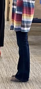 Bringing us gently back on point, I managed to snag a photo of my friend in her bootcut jeans while I was tearing down my musical equipment on Sunday. I'm not entirely sure what this group of women was doing, but I think they were learning American Sign Language. Anyway, I took a picture of the whole group, then cropped it to show the relevant part, and to protect the identity(ies) of those involved. My friend doesn't wear super high heels, but she does wear heels almost every Sunday, and this style, though on the casual side for me, seems to suit her. -