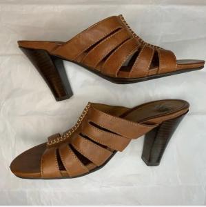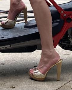 At No. 3 we have. . . BCBGirls Bonny beaded wooden mules. . . Wait, didn't I just list that two posts ago? Yes, I did, but this is pair No. 4. The above was pair No. 2. Pair No. 4 has somehow managed to survive and squeak by pair No. 2 at 117.3 miles (189 km). I honestly didn't think they would make it, because pair No. 4 has had what I perceive to be weak shanks from Day 1. The heels on this particular example of the breed have always been more flexible than what I would like. I would never have guessed that they would last longer than pair No. 2. However, since 2022 when pair No. 2 yielded up the ghost, I have changed my walk significantly, and I do believe I am much easier on heels than I used to be. But wait, there's more! In the very last miles, right before I was to surpass my previous Bonny record, I tripped on an uneven part of the pavement, and both shoes went flying. Somehow, I managed to stay upright, but I lost both shoes rather violently. I thought to myself, "Well, that's the end of those, and right before I broke the record, too!" Amazingly, there was no damage to either the shoes or to me. I do not know if anybody actually saw this happen, so it may be that my pride managed to escape damage as well. A word about mules in general, as @higherheels alluded to elsewhere. To me, there are two broad categories, and I'm not talking about open toe vs. closed toe, stiletto vs. block heel. I'm talking about flappy vs. non-flappy, categories that I am claiming creation of, because I've never heard anybody else refer to them that way before. To me, it's THE most important distinction. The Bonnys are flappy mules and have but a fairly thin leather band across the toes, which means that with every step, the insole of the shoe comes away from the bottom of the back half of your foot (similar to the much-hated flip-flop), then returns with a flapping sound. We'll save sound preferences and dislikes for another time, that being an intrinsic part of the flappy mule experience. Non-flappy mules typically come up much higher on the instep, and in this way, full contact between the bottom of your foot and the insole of the shoe is maintained at all times. Non-flappy mules have a sound that is indistinguishable from any other high heel with the same heel type. Despite being flappy mules, and being very easy to kick off (and put back on) at will, they are very good walking shoes. Don't ask me to explain it, but among four pairs so far, I've got 350 miles of walking experience, and I still enjoy them for that purpose. They've even been to Chicago on vacation! Stay tuned for the runner-up spot, and the winner, coming to a forum near you.