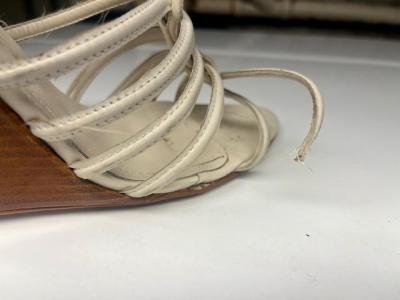 It was a shame to pitch the sandals after but one wearing, but like I said, evidently I had not seen fit to wear them for a year and a half after I bought them. Had it been a pair of shoes that I just couldn't live without, MAYBE I would have put some effort into trying to repair them, but I've been down this road before, and I've had a 0% success rate at making this kind of repair. The good about these sandals: The shape of the slope up to the heel was one of the best fitting shoes I've ever owned. At 4 1/4", you could definitely tell you were wearing heels, but they felt so natural. I wish all of my shoes fit like that. The bad: Due to their super strappy design, getting those puppies on and feeling right was a several minute process. It did not take a great deal of contemplation to decide to bin them.