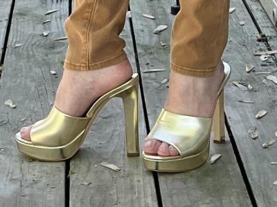 The High Heeled Ruminations Of Melrose Plantmlroseplant replied to mlroseplant's topic in For the guys I finally got around to taking some pictures this week. Because the leaves are back on the trees, I now have a built-in place where the sun won't wash out the pictures, so maybe this will happen more often. I have said before that I am not the type of person to walk through the neighborhood with my tripod (or a companion), looking for the perfect photo op. Having said that, I don't usually photo-bomb like I'm going to today, but somehow or other, I managed to take the perfect set. Usually when I do these things, I take at least half a dozen pictures to get one decent one. This time, I didn't delete any of them. They all came out pretty well. Therefore, y'all have to suffer as a result. Today's shoe selection marks the beginning of sandal season, and I took some new sandals for their first public outing, those being Nine West Wilia3. I have no idea what Wilia1 and 2 might be, but evidently, these are Wilia the third. It's not truly their first public outing, because I actually vetted these with a one mile walk a couple of weeks ago, just to see what category they might fit into in my shoe collection, but this is the first time that others could really see them. They were all right for a few hours, and they're all right to walk a mile. They are not uncomfortable, but neither are they a pleasure to wear. They're kind of just there. Nine West is slipping. These are disposable shoes at a disposable price. They are not leather, they are not supple, and they don't appear to be particularly durable. However, they look kind of cool. On edit: Yeah, posting five small photos instead of two medium sized ones is unsatisfactory. I will not do it again, except in special circumstances.