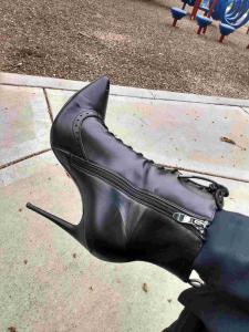 Some time ago in another thread, the presumedly long discussed and possibly resolved issue of what constitutes a stiletto heel surfaced for yet another round of unnecessary debate and comment. I posted that although I love stilettos, I could not imagine that I would ever wear a pair of such heels out and about, let alone to work/the office. I believe that I had legitimate concerns regarding how appropriate they may be for a professional environment and the possibility of breaking a heel while simply walking from place "a" to place "b." Well, much to my surprise, all of that changed today as I wore a pair of 12cm stiletto ankle boots to the office for the first time. June 19th is a holiday here in the states and I expected that just about "everyone" would take off on the 20th for an extended weekend. Given that I still do not have a substantial amount accumulated time to take away from my job beyond holidays and weekends, taking a day off now would have a direct impact on travel plans for the remainder of the year. Thus, I decided not to do so and head in to the office for the day despite how much I just wanted to stay in bed this morning. As I recognized that very few other people were probably going to head to the building, I started to warm to the idea of wearing a pair of very high stiletto ankle boots to the office for the day. I saw this as a "test" to see how I enjoyed it and determine if there were going to be any "problems" if I did so. I decided to wear a pair of very long trousers as to cover almost all of the heel and a simple top for the day (and yet, is was still houte couture). In sum, the experience of wearing such heels was incredible. As 12cm is the very limit of what I can reasonably handle, it took me some time to get the mechanics of it down so that my cadence was smooth. I had to remember to stand up straight, bend the knees a bit, and walk at a much slower pace so as to take longer strides. Although, I more or less "had it down" by day's end, I think it I still need a bit of polishing/practice. An errand followed the end of the work day on the way home and once I got into my place, my knees were feeling it but everywhere else was fine. Needless to say, I immediately started planning the next time when I will be wearing a pair of similar heels to the office. In all the experience was utterly intoxicating! So yes @mlroseplant you were correct in your prediction that I would eventually be wearing stilettos to the office! A note on the photo - at lunch, I felt the need to get out of the office as reviewing dozens of pages of intricate financial documents can only be fun for so long. I walked over to the small park across the street and sat on a bench for a few minutes to clear my mind. The mere fact that I was out in a place were the world could see me wearing my stilettos is that to which I can find not adequate words to properly describe. For some reason, I continue to have issues of posting photo to the original post....