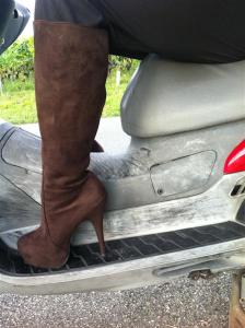 Jabble Posted February 9, 2012 Author Posted February 9, 2012 Hi all, Actually I almost drive everyday in heels, at the moment I drive a car, as it is freezing, but most of the time, I ride my scooter! Here are some pictures! I drive the car with the black leather boots... Nice boots, especially the first pic.